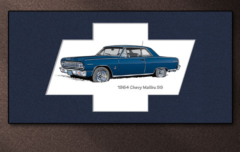 The MAT is custom cut in the shape of the CHEVY LOGO and is available in BLUE (pictured), MAROON, DARK GREEN, BLACK and GRAY.